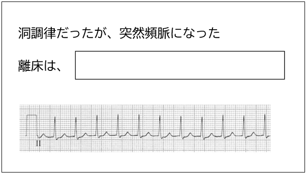 発作性上室頻拍で高度の頻脈のため離床は中断し、頻脈発作の治療を優先する。投薬治療または迷走神経刺激により頻脈発作が抑制されれば、離床は再開できるが、頻脈発作を繰り返すことがあるので、離床中の脈拍の変化に留意する必要がある。