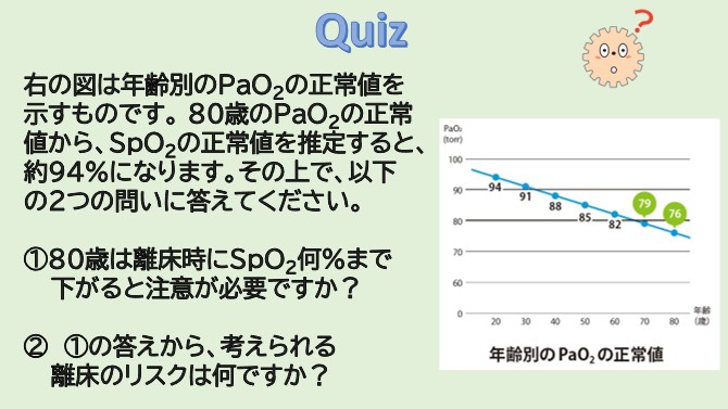 2.80歳以上では、軽度の低酸素でも90%を下回り、組織が酸素不足に陥る可能性があるため、離床時には呼吸状態の変化に注意が必要である。