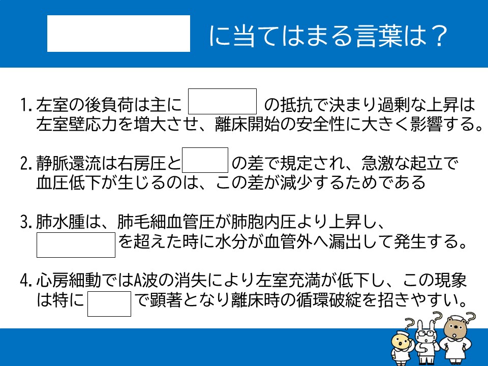 今回はもうすぐ開催される注目の新講座、「解剖からトコトン読む 呼吸と循環の生理学総復習セミナー 循環編」より、穴埋め問題を出題。循環の解剖・生理に関する知識の腕試しに、是非、チャレンジしてみてください。
