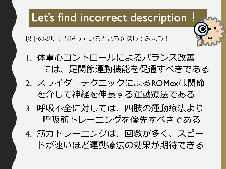 今回は、まもなく開催される新シリーズ、「アプローチの引き出しを倍増!ベテランの経験知とエビデンスに学ぶ運動療法実践全4回」より、間違い探し問題を出題。運動療法に関する知識の腕試しに、是非、チャレンジしてみてください。