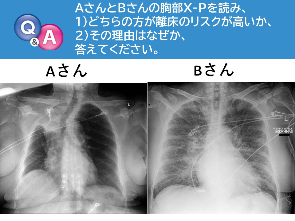 2) Aさんは右上葉に無気肺を認めるも心拡大なし。Bさんは著明な心拡大はないものの、肺血管陰影の著明な増強と、カーリーA線およびB線を認め、急性心不全が示唆されるため、離床のリスクが高いと考えられる。