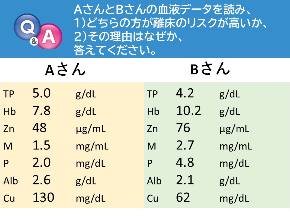 2) 貧血とミネラル欠乏が強く、循環動態変化や急変リスクが高く、積極的な離床はリスクが高い状態と考えられます。
