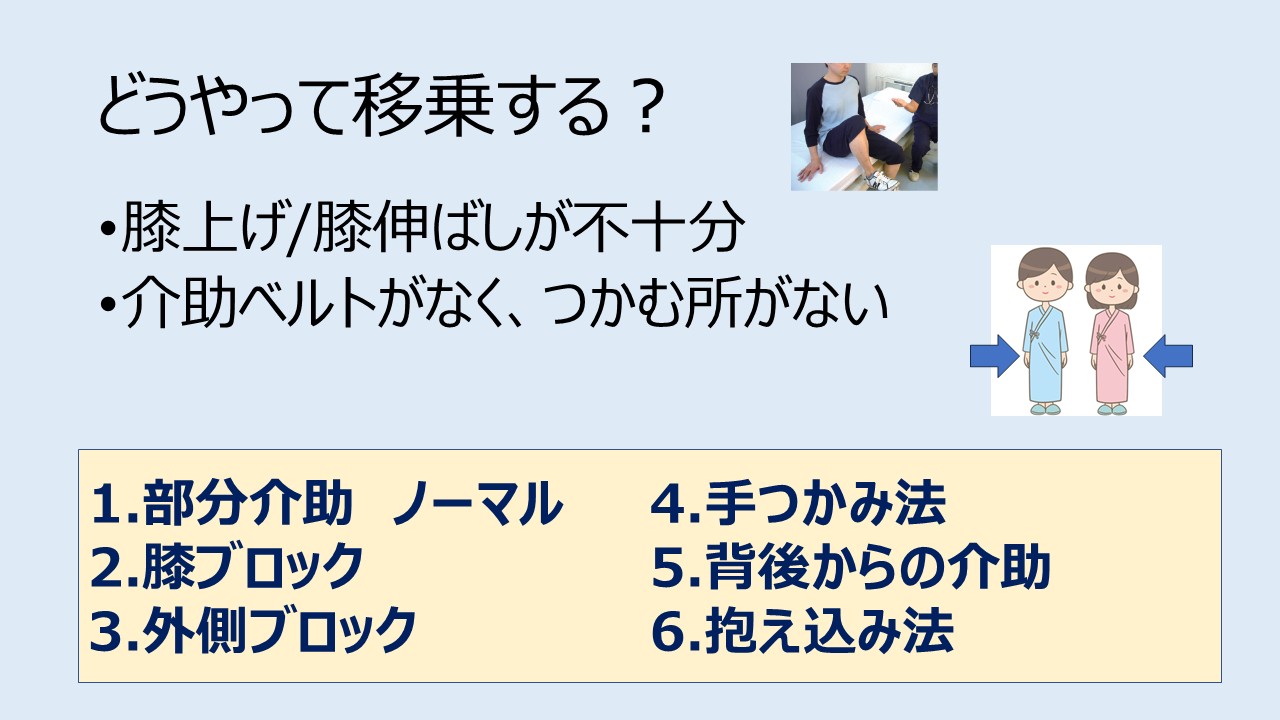 上記の方法が適している理由、介助の方法は移乗動作講座で詳しく解説されます。