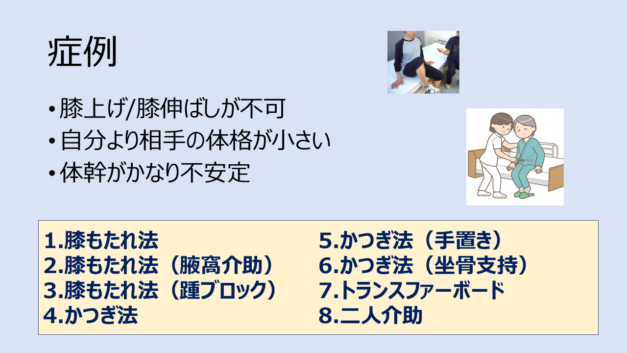 上記の方法が適している理由、介助の方法は移乗動作講座で詳しく解説されます。