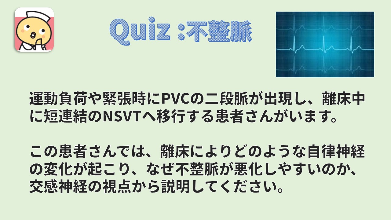 離床により交感神経が亢進すると、心筋の興奮性が高まり、期外収縮が出やすい状態になります。その結果、もともと出現していたPVCの二段脈が増悪し、連続した心室性不整脈(短連結のNSVT)へ移行するリスクが高まるため、離床時には注意が必要です。