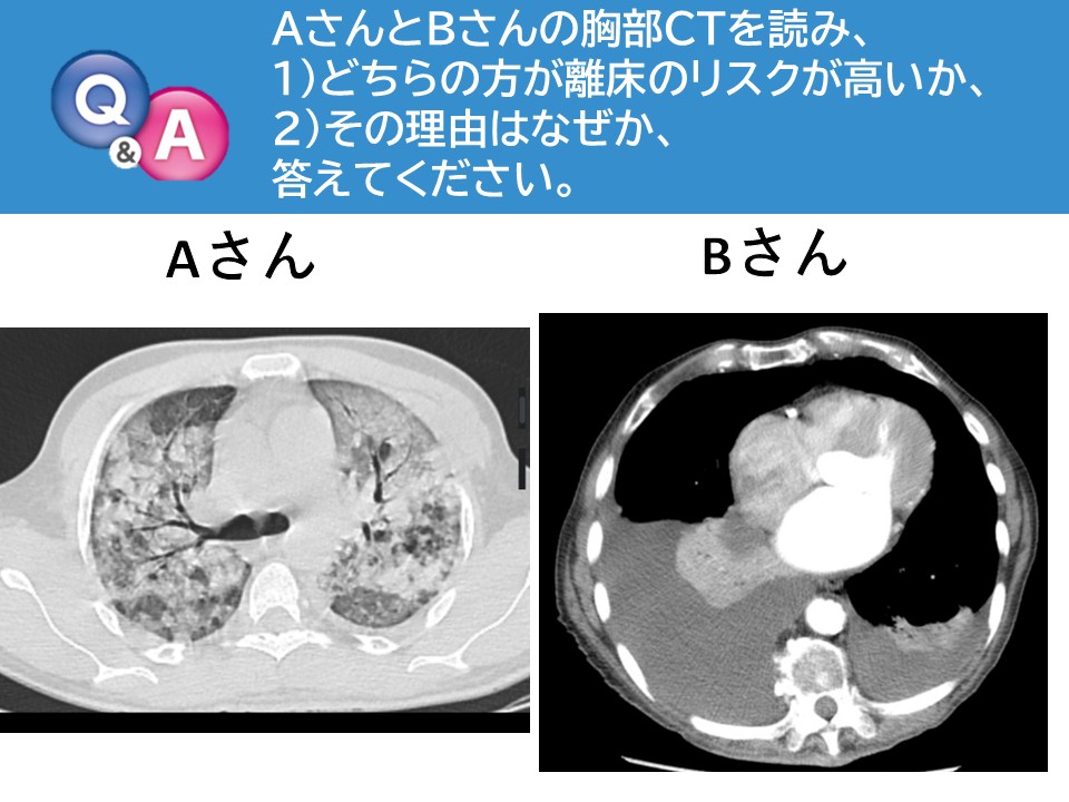 2) Aさんは両側中下肺野にびまん性すりガラス影とコンソリデーションを認め、ARDSが疑われ、体位変換や離床で肺胞虚脱による急激な酸素化悪化のリスクが高い。Bさんは右側に大量胸水と無気肺を認めるが、左肺の換気は比較的保たれており、体位調整で改善を図りつつ慎重に離床を進めることが可能と考えられる。