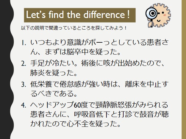 今回は来週開催される人気講座、「本当にあった怖い話 症例で学ぶ呼吸・循環アセスメント50〜急変を防ぎ、離床を成功させる究極の評価〜」より、間違い探し問題を出題。呼吸・循環アセスメント力の腕試しに、是非、チャレンジしてみてください。