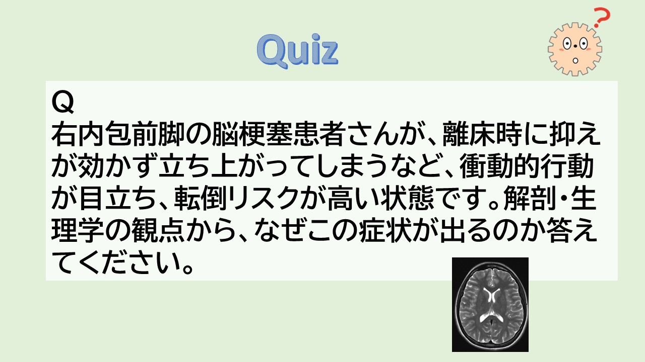 基底核は運動だけでなく前頭前野—線条体ループにより行動選択と抑制を担うため、内包前脚の障害により、線条体・淡蒼球—視床回路の抑制機構が破綻すると反応抑制が効きにくくなり、危険行動の制御低下として表れる。