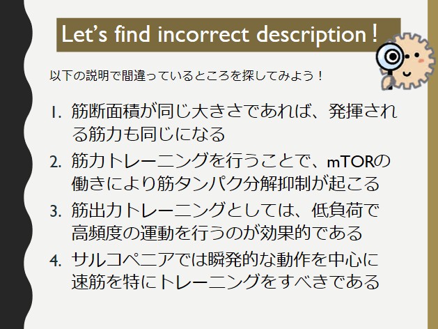 - サルコペニアでは抗重力筋である遅筋を特にトレーニングするべきである