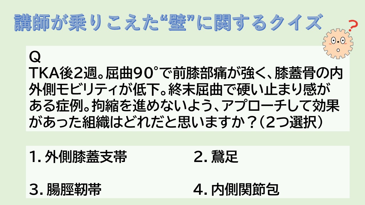 間もなく開催される注目の新講座、「ベテランがぶつかった“壁”から見える 整形外科リハビリのベストアプローチ 膝関節編」より、問題を出題。