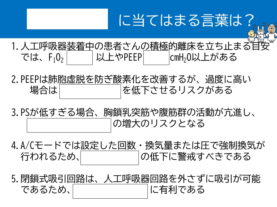 今回は来週開催される人気講座、「離床学会メソッドで学ぶ!呼吸アセスメントと離床マスターコース 人工呼吸器編」より、穴埋め問題を出題。