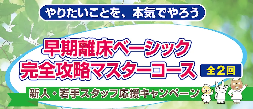 しっかり離床を進めたいけど知識がなくて・・・そんなあなたにピッタリのコースが登場! 離床の教育20年の実績がある当会の講師陣から、寝たきりの弊害、最新エビデンス、アセスメント、臨床での実践まで、離床のことをゼロから一通り学べます。離床のプロから確かな知識を学んで、スタートダッシュをきめてみませんか?