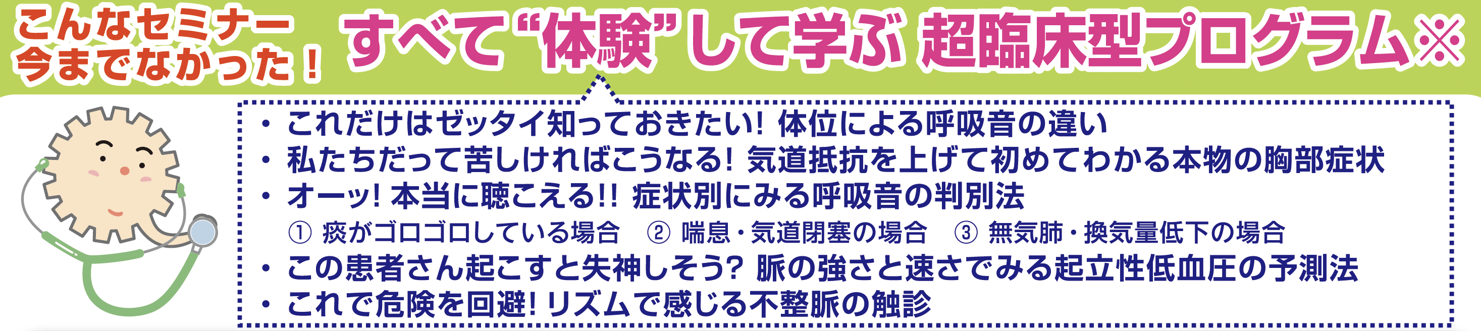 いろんなセミナーを受けてみたけれど、健常者相手にアセスメントのまねをするだけでは勉強にならない!と感じたことはありませんか?そんなあなたにこんな講座を考案!「聴くと本当に痰の音が聴こえる」「起立性低血圧を起こすときの脈の変化がわかる」といった状況を、セミナー中に実体験!!より臨床に近い状態でアセスメントの本質を学びます。こうした症状の特徴をつかめば、急変しそうな患者さんをいち早くみつけて対応できること間違いなし!さあ、あなたも現場感覚で創られたこのセミナーに参加してアセスメント名人になってみませんか?