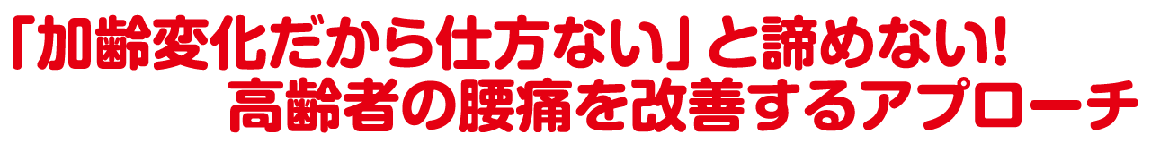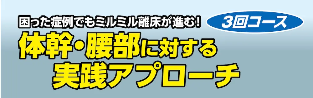 トップページ教育セミナー困った症例でもミルミル離床が進む!体幹・腰部に対する実践アプローチ 圧迫骨折・変形編 高齢者の体幹の問題で多いのが圧迫骨折と変形。加齢による問題はもちろんありますが「アプローチできない」は誤りです。この講座では、“改善”“維持”“進行予防”の3つをキーワードに、これらを見極める臨床眼とアプローチの実際を伝授します。 ※この講座は離床アドバイザー取得コースの実技 0.5単位・学会認定資格更新 5 ポイントを取得することができます ※シリーズで受講を希望される方は、下記リンクよりお申し込みください。