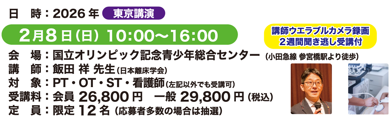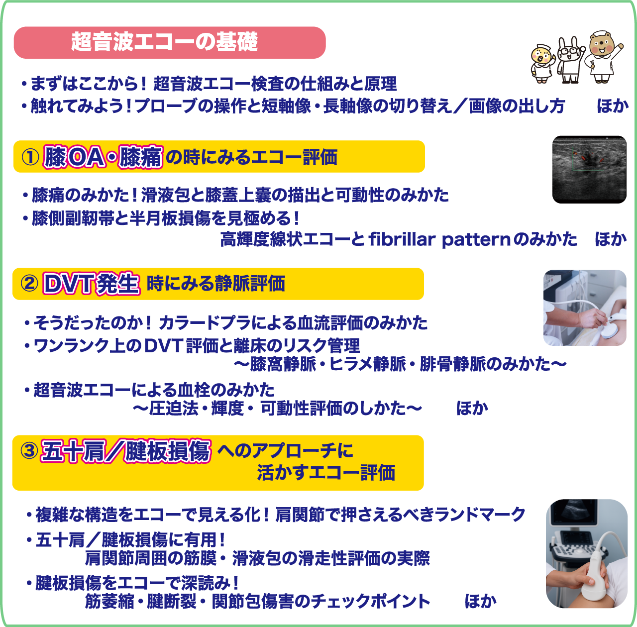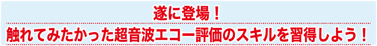離床技術プレミアムコースにいよいよ「超音波エコー評価」が登場!離床時の評価で「脱水があるのかな…」「血栓は大丈夫?」「筋と関節包の滑走性は?」など、目に見えない障害や離床のリスクが、自分の手で確認できたら最高ではないですか?そんな悩みは超音波エコーに全てお任せ!離床のリスクやアプローチに関わる、運動器や循環評価、栄養状態のチェックまで解説。少人数制で、繰り返し練習するから、初心者でも、プローブを当てて、見たい画像を描出できるレベルまで引き上げます。限定12名ですので、この機会をお見逃しなく!