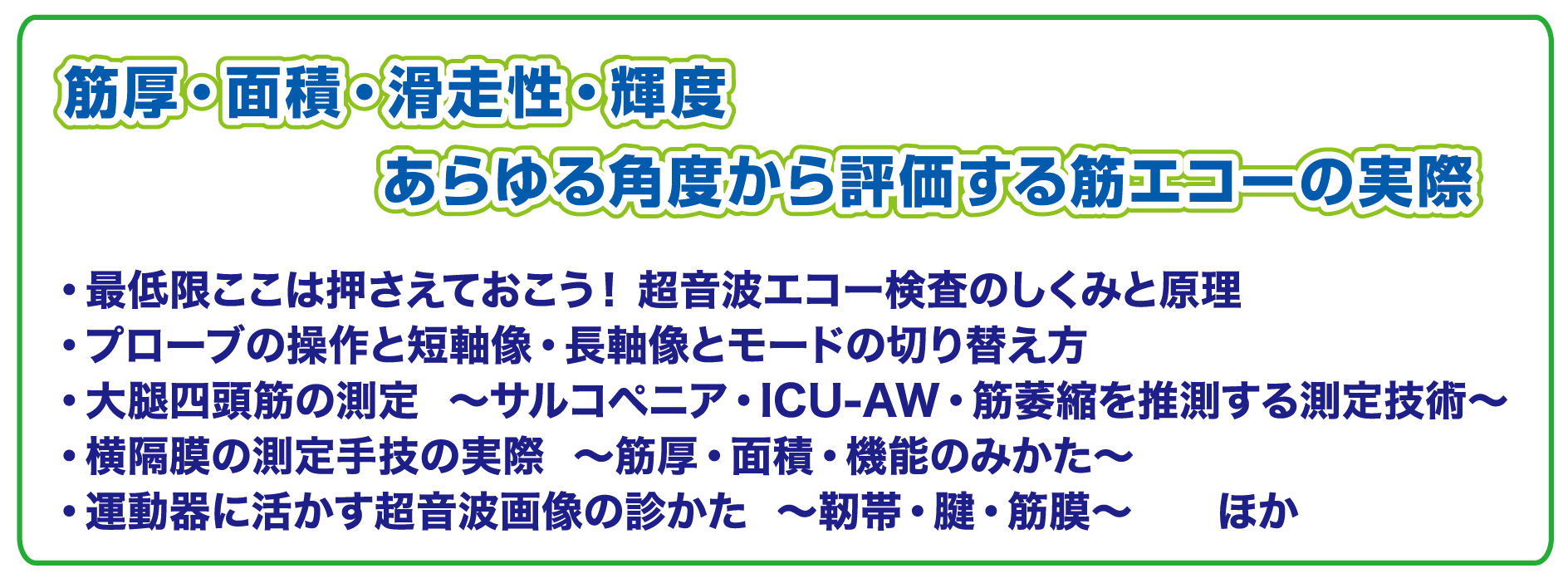 筋肉の評価はフィジカルではなく、画像で評価する時代に変わってきています。臨床・研究で、必須となる技術を、筋エコー界のトップランナー、中西医師から学ぶ、希少な機会を実現。必ず来るであろう新時代を先取りして技術を高めようという方、研究領域でのデータ採取のために技術を身につけたい方、先着8 名の限定ですので、早めにお申し込みください。