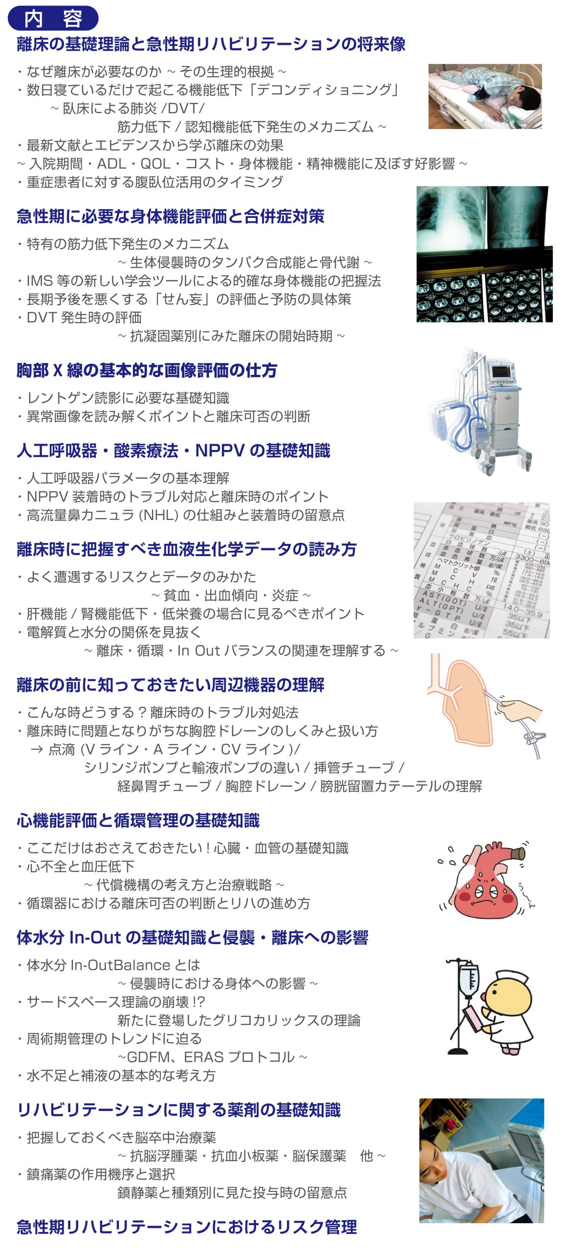 脳血管障害・外科術後の急性期や救急・救命病棟におけるリハビリテーションに必要となる臨床検査・薬剤・周辺機器の基礎知識を、この領域のベテラン講師陣がご指導致します。日常の臨床で培われた評価のコツをわかりやすく解説。教科書を見ただけではわかりにくい知識の取得を目指し、即戦力を養成します。臨床家を育成する目的で立案された独自のプログラムで、治療の幅を広げるチャンスです。新人を迎えたこの季節、またとないこの機会に是非学んでみませんか?