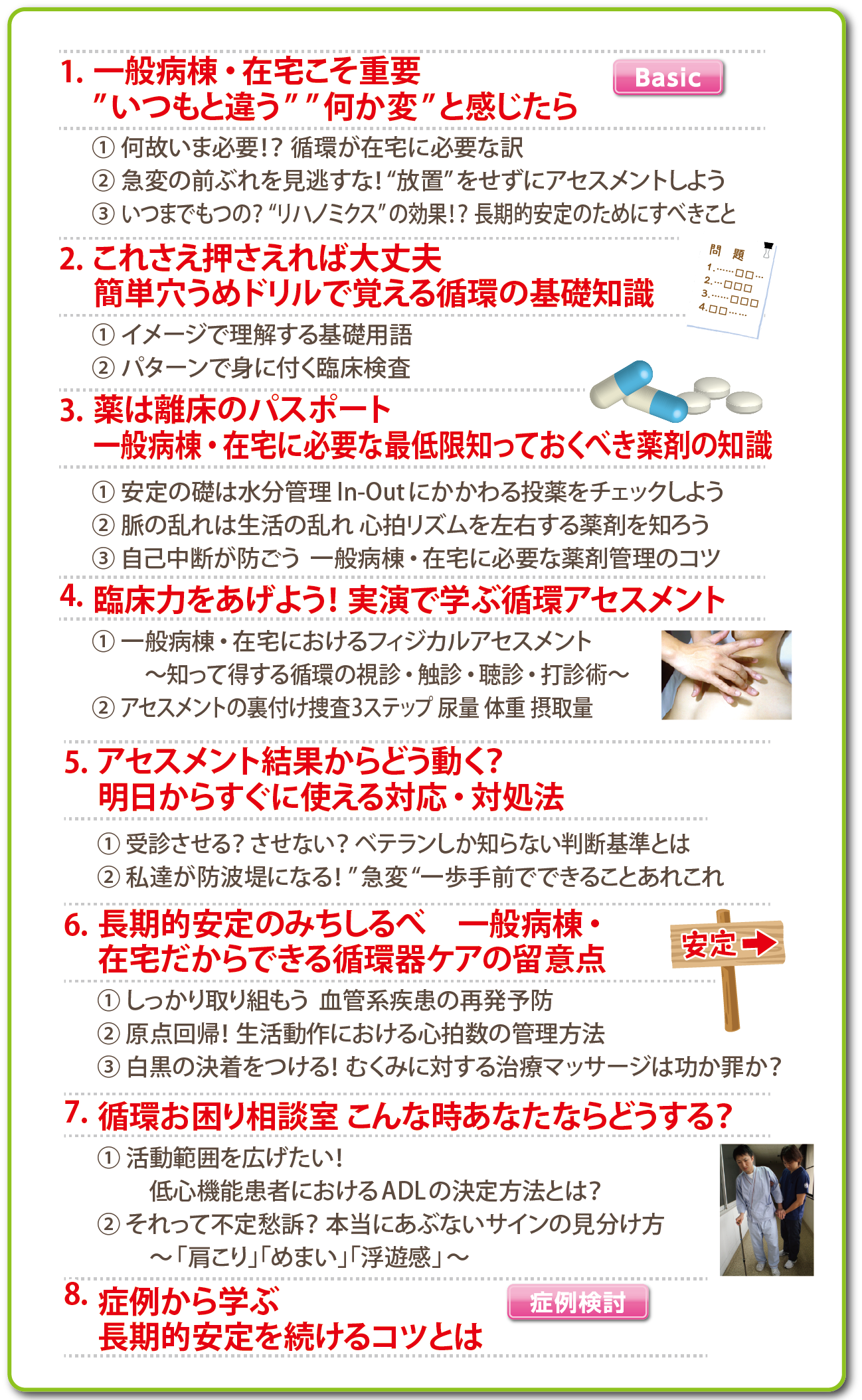 循環機能の評価はむずかしいので、できれば避けたいところ。一般病棟・在宅の現場では「いつも問題がないから大丈夫」と“見て見ぬふり”。でも、循環は安定に最も欠かせない要素なので、実は不安なのが本音ではないでしょうか。そこで、当会では一般病棟・在宅に必要な循環に関する知識をまとめた集中講座を開催。“いつもと違う”をいち早く察知し“血圧を測るだけ”の循環アセスメントからの脱却を目指します。「評価していないけど結果オーライ」が「評価して完璧にOK」に変わる学会自信の講座を受けて、あなたも漠然とした循環の不安を解消してみませんか?