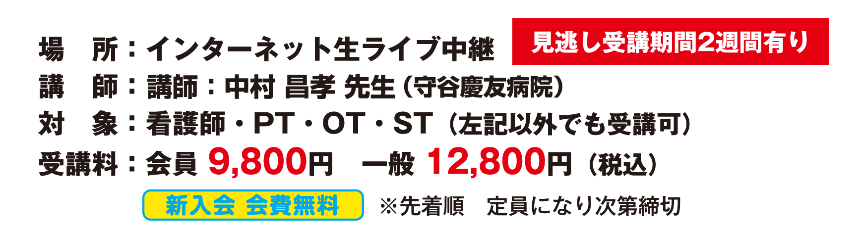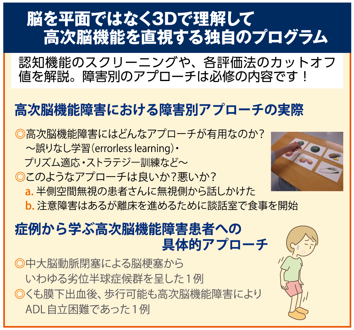 トップページ教育セミナー高次脳機能障害の重症度と障害別に評価・アプローチ~エビデンスと経験知から学ぶ実践のコツ~ 「運動麻痺も感覚障害もないのに転倒を繰り返す」「 嚥下テストに問題がないのに誤嚥してしまった」「 急に怒って離床を拒否された・・」そんな症状は高次脳機能障害が影響しています。当会では、脳画像をヒントに高次脳機能障害の症状と病態を極限までシンプルにして理解する講座を考案。症状理解とアセスメントに終始せず、得られた情報から臨床のアプローチ・ゴール設定に活かす方法を徹底的に学びます。 ※上記講座受講で離床アドバイザー理論1単位を取得できます。