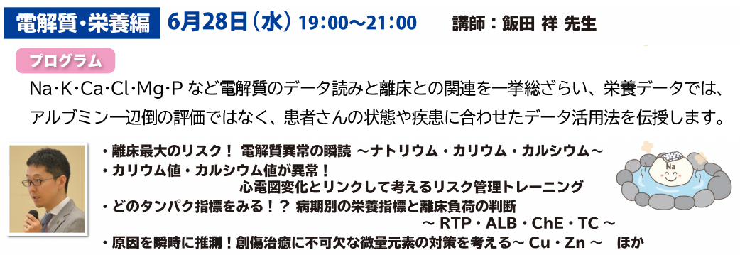 これまで何人もの心電図ギライを救ってきた、大好評の心電図セミナーがパワーアップして平日コースでついに登待望の血液データ新講座がついに登場! 今回は「瞬読」がテーマ。瞬読とは血液データを見て、一瞬で問題となるデータを見極めて、臨床に活かすことです。血液データの意味はある程度わかったけれど、読み解きに時間がかかる、という人は多いはず。この新コースでは、データを瞬時に判断する能力を引き上げるために、「瞬読エクササイズ」で繰り返しトレーニング。ぼんやりしていたデータの理解を、グン!と引き上げます。さあ、いまこそ平日2時間を活用して、瞬読の達人を目指してみませんか?