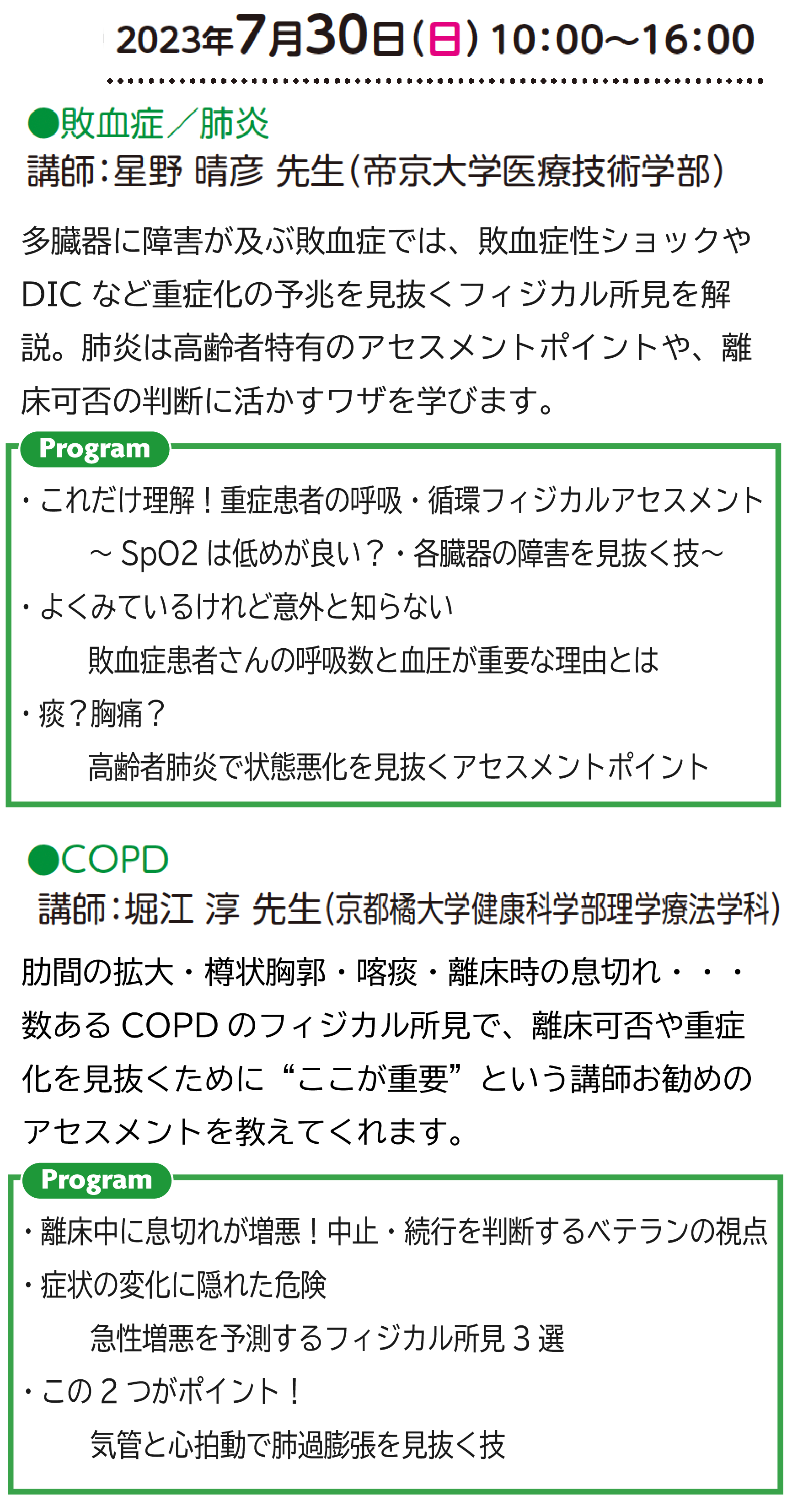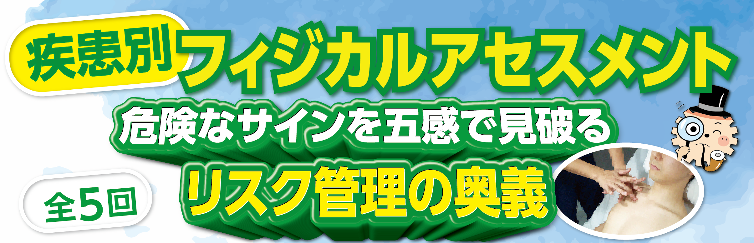 トップページ教育セミナー疾患別フィジカルアセスメント危険なサインを五感で見破るリスク管理の奥義~肺炎・敗血症・COPDのフィジカルアセスメント~ 脱水・貧血・浮腫・・・ひと通りのフィジカルアセスメントは学んだけれど、所見をとっただけでケアや離床に十分活かせていないと感じていませんか?その原因は疾患別にみた症状の特徴をつかめていないから。今回の新コースでは、疾患別に必須のアセスメントを各領域を専門とするベテランが徹底解説。急変回避や離床による状態悪化を見抜く、百戦錬磨の技を教えてくれます。触れてみる医療の真髄を身につける絶好のチャンス!この機会をお見逃しなく。 ※上記講座の受講で離床アドバイザー取得コースの理論コース1単位を取得できます。