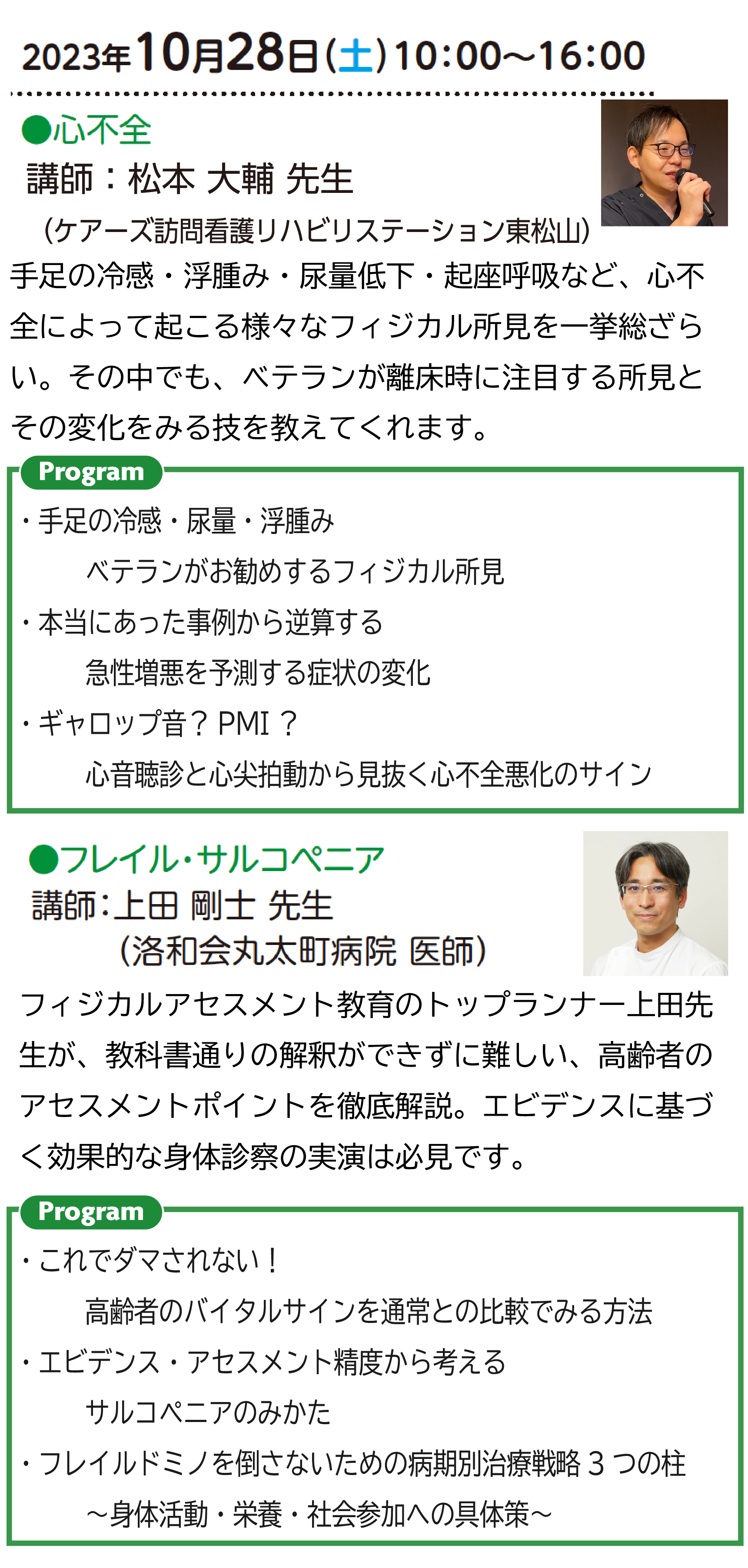 トップページ教育セミナー疾患別フィジカルアセスメント危険なサインを五感で見破るリスク管理の奥義~心不全・フレイル・サルコペニアのフィジカルアセスメント~ 脱水・貧血・浮腫・・・ひと通りのフィジカルアセスメントは学んだけれど、所見をとっただけでケアや離床に十分活かせていないと感じていませんか?その原因は疾患別にみた症状の特徴をつかめていないから。今回の新コースでは、疾患別に必須のアセスメントを各領域を専門とするベテランが徹底解説。急変回避や離床による状態悪化を見抜く、百戦錬磨の技を教えてくれます。触れてみる医療の真髄を身につける絶好のチャンス!この機会をお見逃しなく。 ※上記講座の受講で離床アドバイザー取得コースの理論コース1単位を取得できます。