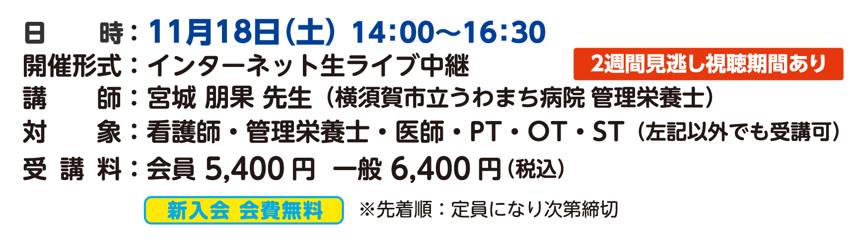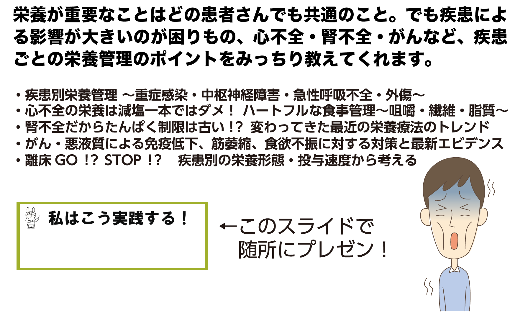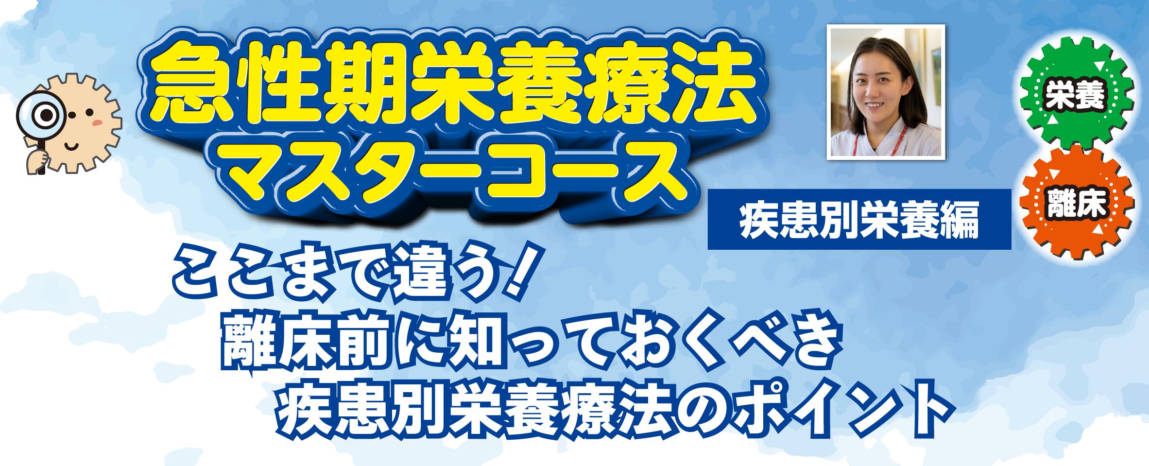 トップページ教育セミナー急性期栄養療法マスターコース 疾患別栄養編 離床で効果をあげるために、栄養管理が重要とわかっていても、カロリーにタンパク量、数多くある栄養評価、疾患特有の栄養など、「選択肢が多すぎて、何をやったらいいの?」と悩んでいませんか?この新講座では、栄養療法のエキスパートが「うちの施設ではこうしている」という実践ベースに、急性期栄養の理論から実践、疾患別の管理まで一気に習得して、実際に臨床でどう動くべきか、学びます。さあ、今こそ臨床のモヤモヤを晴らしてみませんか? ※上記の受講で離床アドバイザー習得コースの理論コース0.5単位を取得できます。