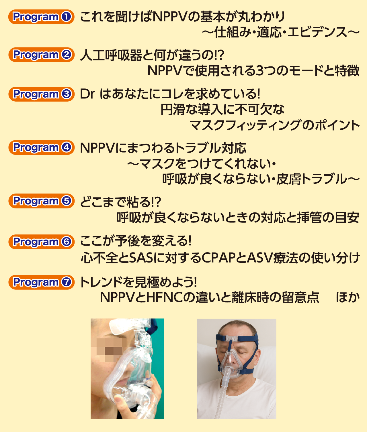 日本離床学会が長年行ってきた、呼吸と離床の教育セミナーがパワーアップして平日コースに登場!侵襲は少ないけれど、患者さんが嫌がってちゃんと着けてくれないなど、臨床で困ることの多いNPPVについて、マスク選択・フィッティングのコツから、離床時のトラブル対応まで実践を学びます。