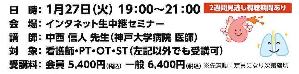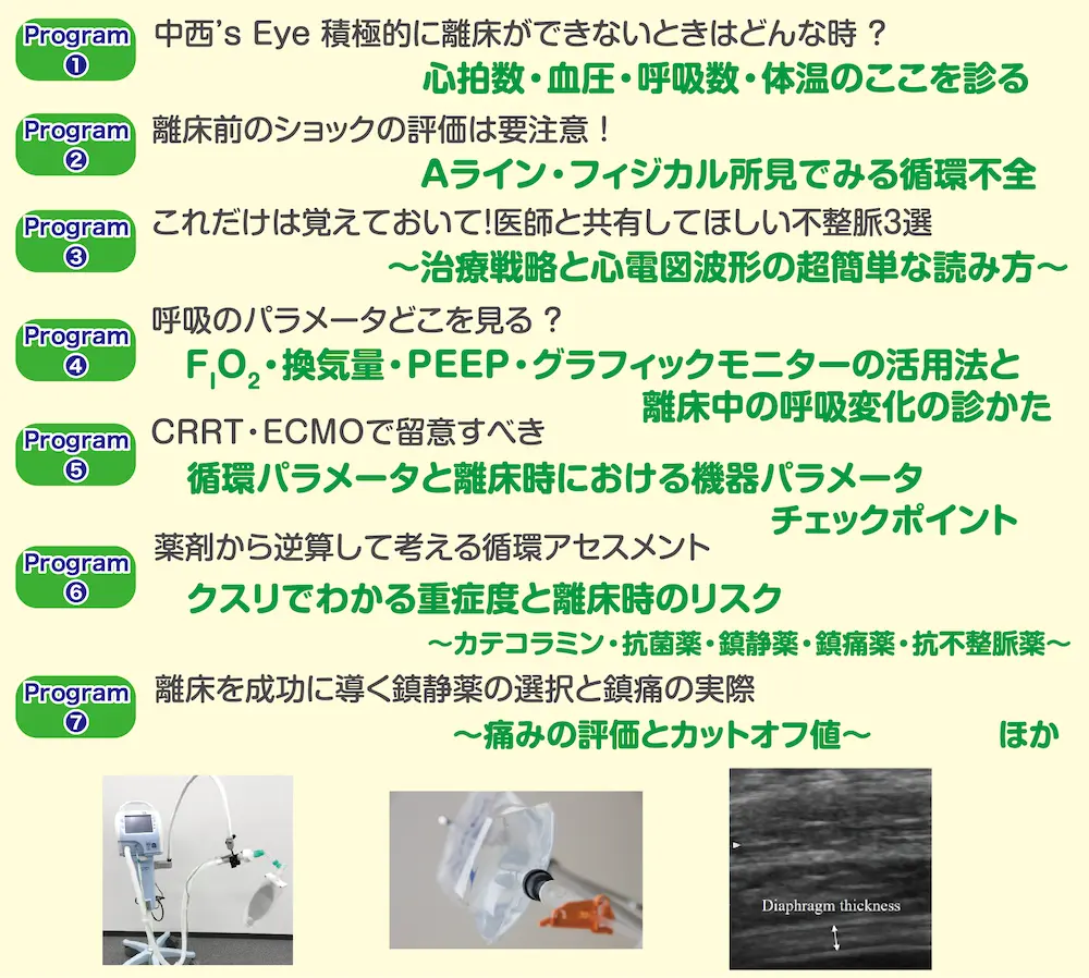 ドクターならではの視点で、データ・各パラメータ・処方の見ドコロを解説。状態悪化の兆し機器やデータ、フィジカルを一通りチェックして、しっかりケア・離床しているのに、状態が悪化する症例に遭遇しませんか?その理由は、1つの角度から評価しているから。この講座では、急性期治療のトップランナー中西先生が、呼吸・循環のアセスメントを「組み合わせ」で判断していくワザを徹底解説。百戦錬磨の現場感覚をもとに、機器・検査パラメータ・薬剤を多角的に評価するアセスメントの“深さ”を鍛えてくれます。あなたも“マルチ”な評価を身につけてアセスメントの達人になってみませんか?