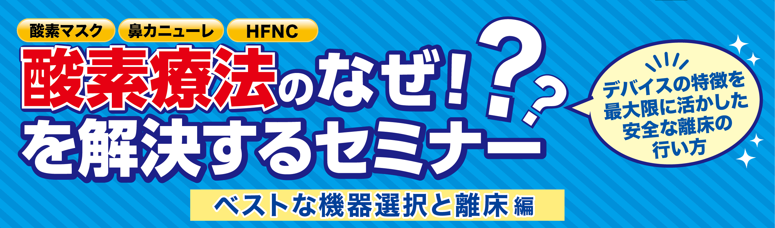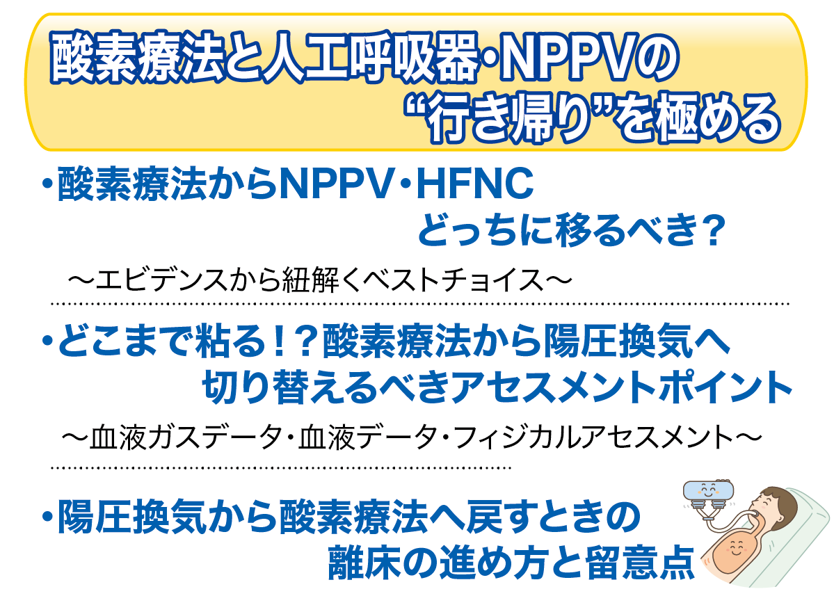 酸素療法の種類は色々あるけれど、流量と酸素濃度を守っていれば大丈夫と思っていませんか?実はその考えはキケン。デバイスの特徴をちゃんと知らないと、呼吸状態が悪化して急変につながることも…この講座では、多岐にわたる酸素療法の知識を日本離床学会講師陣がわかりやすく明快に解説。デバイスの選択と人工呼吸器と酸素療法の行き来について理解を深め、グンと臨床力を引き上げます。さあ、酸素療法の知識を今こそ見直して、日々の臨床に自信を加えてみませんか?