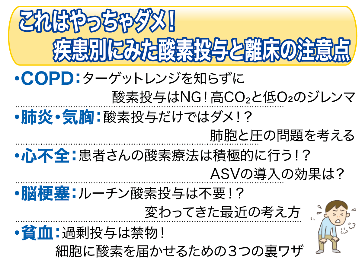 酸素療法からHFNCや陽圧換気に移るとき、陽圧換気から酸素療法に戻るときに、どのような呼吸変化に注意して離床を進めるべきか、超臨床的に解説。さらに、呼吸不全だけではなく、心不全、脳梗塞、貧血など疾患別の酸素療法と離床の関連についても教えてくれます。