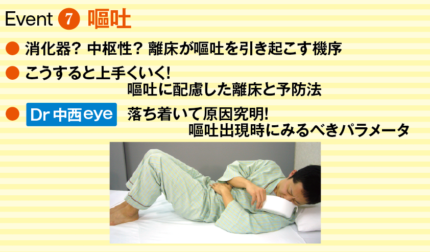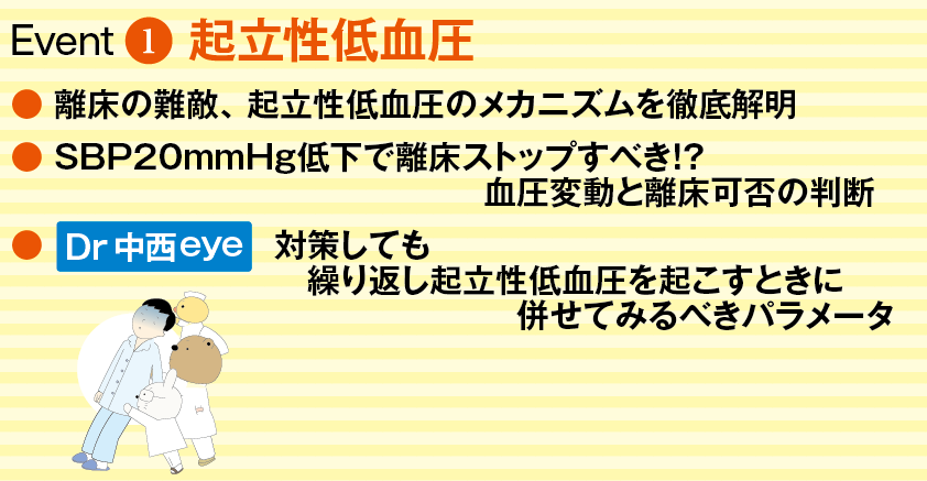 前よりグン!と早くなった離床のタイミング。でも、起こすことには“アクシデント”はつきものなので「安全に進める特効薬はないの?」と皆さんから悩みの声が・・そこで離床学会が考案!危険を回避するために必要なアセスメント能力を、エッジの効いた臨床眼をベテランから学ぶ講座を開催。起立性低血圧・不整脈・低酸素血症・めまい・意識レベル低下・痛み・嘔吐の7つの有害事象について、前半は症状が起きる病態、有害事象を起こさない離床の進め方を解説。後半には、Dr中西 eyeで医師の視点から有害事象の前兆をどう見つけているか・どう予防・治療しているか、臨床的視点で徹底的に教えてくれます!