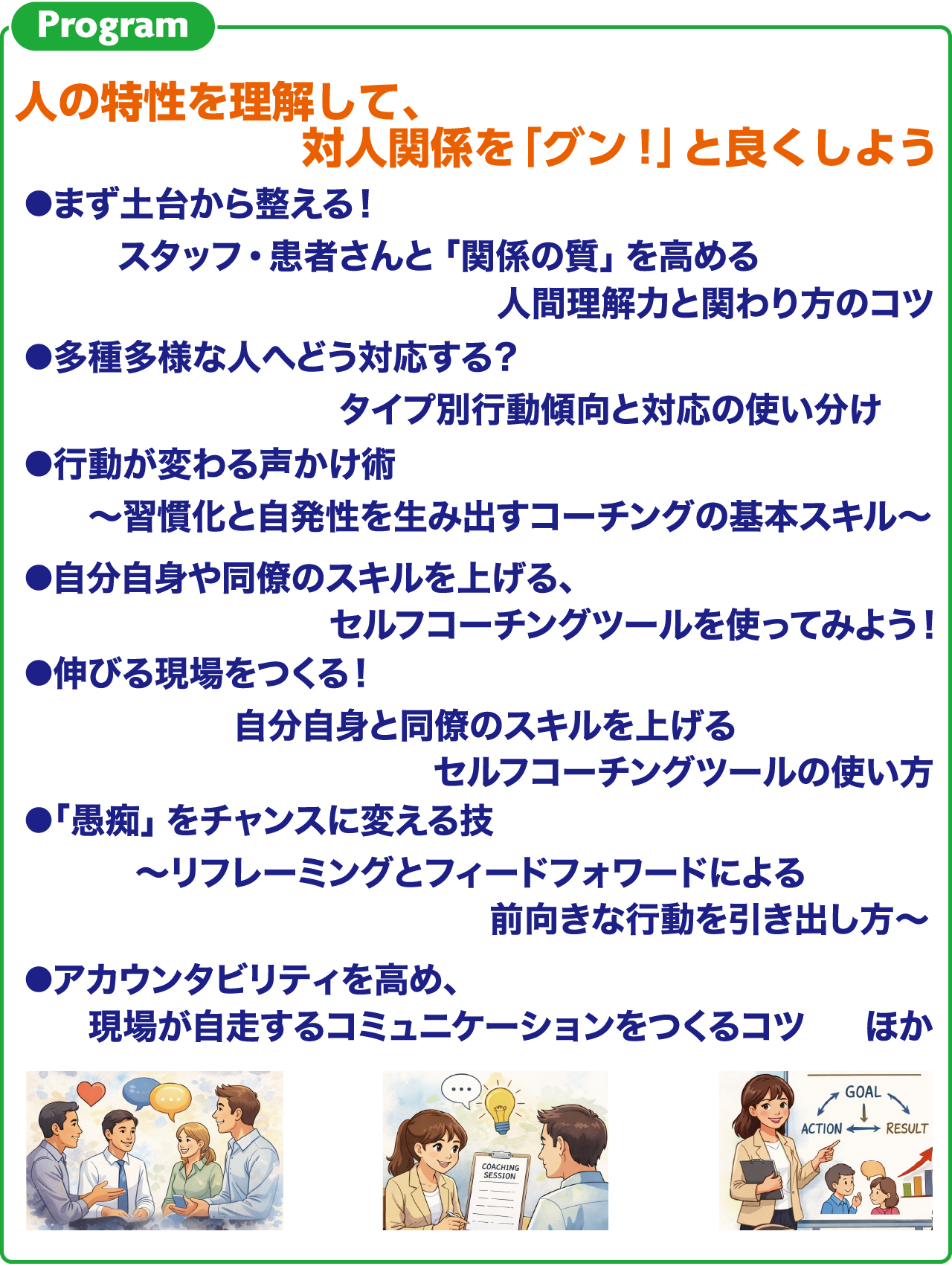 どんな職場でも、人間関係のつまずきは仕事の停滞に直結します。この講座ではコーチングの基礎として、スタッフ・患者さんとの「関係の質」を高める人間理解と関わり方を土台から整理。タイプ別の行動傾向を踏まえた対応の使い分け、行動を習慣化させ自発性を引き出す声かけ術を学びます。さらにセルフコーチングで自分と同僚の成長を加速し、愚痴を前向きな行動に変えるリフレーミング、現場が自走するアカウンタビリティのコツまで、明日から使える技に落とし込みます。