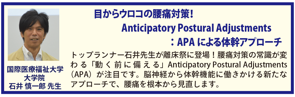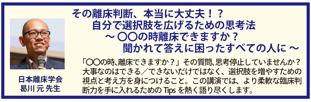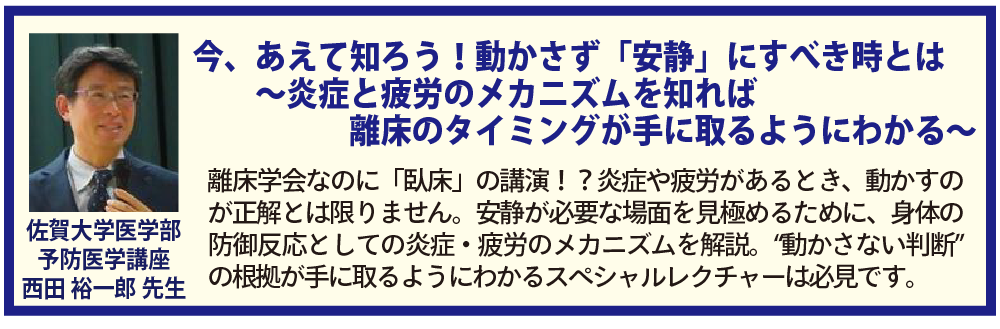 毎年恒例の日本離床学会 冬季学術集会を今年も開催します。今回のテーマは「Re: Mobilization~ もう一度、離床の原点へ。もう一歩、その先へ~」として、改めて“臥床”と“離床”を生理的に深く考える特別講演のほか、明日の臨床からスグに使える実践ポイントが学べる教育セッションが充実。最新知識をトップランナーが語る一歩先ゆく離床セッションなど、多職種が注目のプログラムが満載。離床に関わる全ての人が満足できること間違いありません。今回限りの企画を、お見逃しなく!!