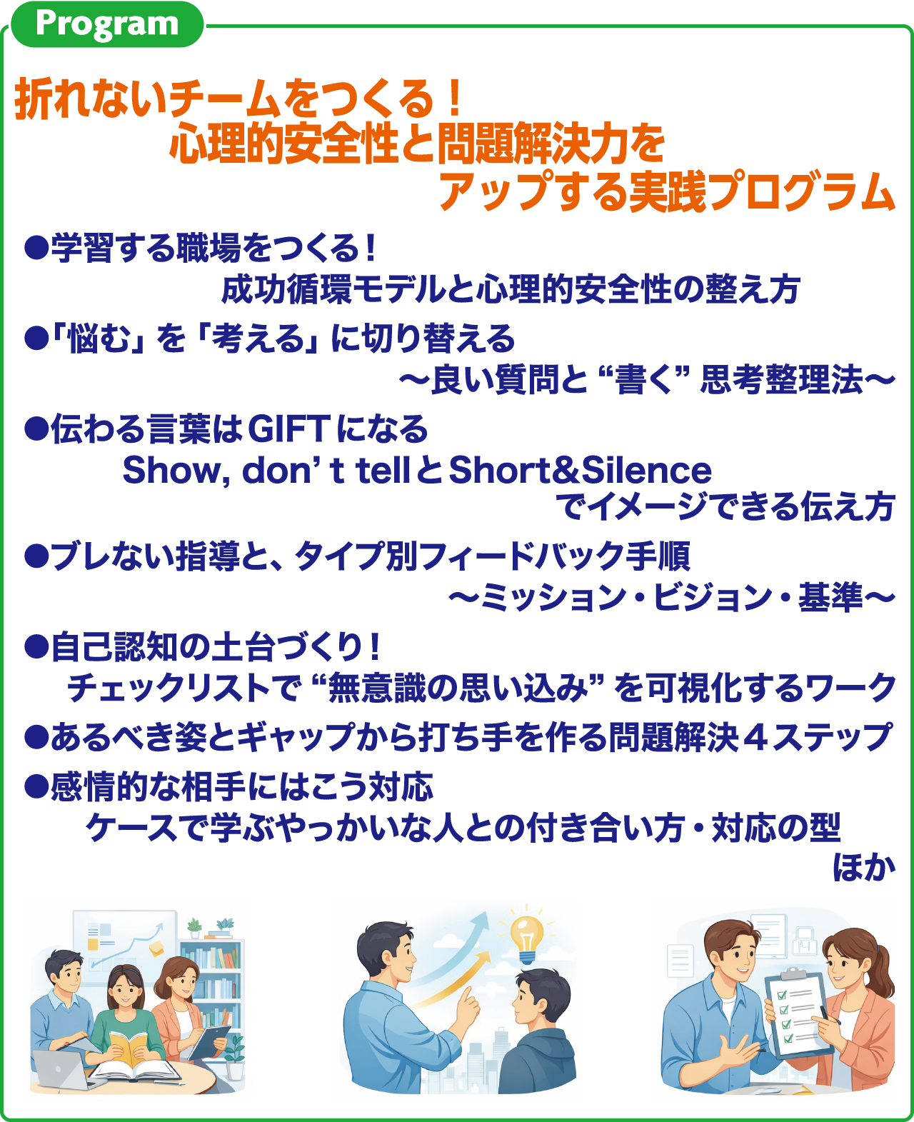 自発性が連鎖する職場をつくるために、プロコーチの対話術と問題解決の型を実践的に解説します。成功循環モデルを軸に、心理的安全性と高い基準を両立させる環境づくり、悩みを“考える”に切り替える良い質問と“書く”思考整理を習得。Show, don’t tellとShort&Silenceで伝わる言葉に変え、ミッション・ビジョン・基準でブレない指導とタイプ別フィードバックも整理します。さらに無意識の思い込みを可視化し、問題解決4ステップで打ち手を設計。感情的な相手への対応もケースで練習し、現場が自走するコミュニケーションへつなげます。