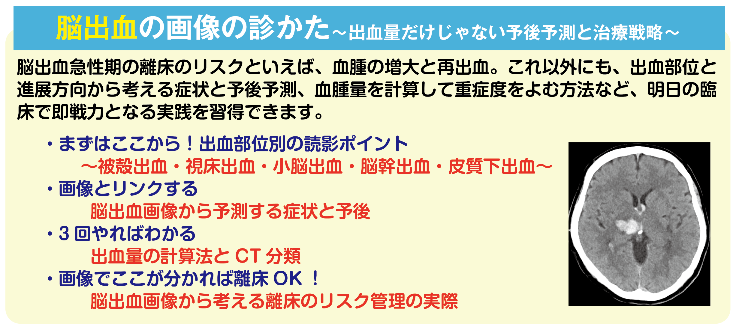 トップページ教育セミナー脳出血の画像の診かた~出血量だけじゃない予後予測と治療戦略 脳画像が読める、憧れのスタッフに今こそ生まれ変わりませんか?「脳画像をゼロからしっかり学びたい」方から、「病態理解や回復予測をさらに深めたい」ベテランの方まで、レベルアップできる講座が登場!脳画像のエキスパートが、脳卒中の病態・予後予測と画像の関連について、わかるまで徹底的に教えてくれます。 ※上記講座の受講で離床アドバイザー取得コースの理論コース0.5単位を取得できます。