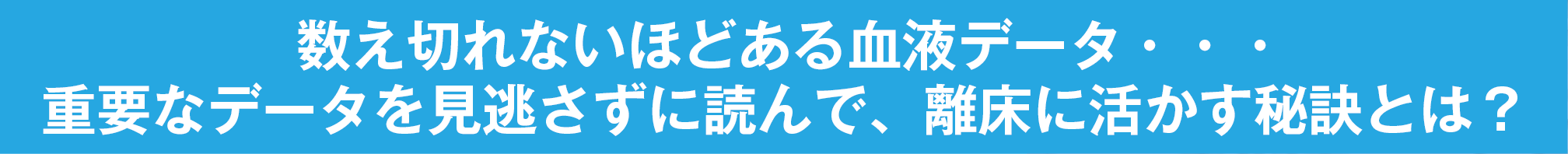 いよいよ当会人気の血液データ講座「各論シリーズ」が開催されます! このシリーズ講座では、ベテランの医師とコメディカルが、それぞれの立場から“これは重要” というデータと、それにまつわるフィジカル所見について徹底解説。臨床的なデータの解釈や、データを離床に活かすワザを伝授します。さあ、今より一歩データを深読みして、患者さんのケア・離床を進めてみませんか?
