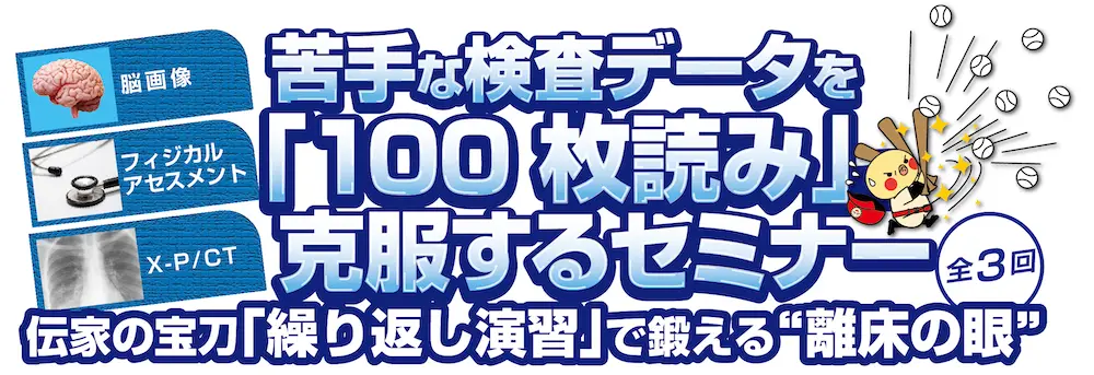 検査データをいくら勉強しても身につかない…と悩んでいませんか?そんな悩みを吹き飛ばす最強の解決策は「100 枚読み」。繰り返し英語を聞いていると、自然と身につくのと同じように、様々な症例のデータ・画像を繰り返しみていると、読めるようになるからアラ不思議。このコースは、特に臨床で重要な、脳画像・フィジカルアセスメント・レントゲン・CT について、ポイントを押さえた上で、実際のデータを100 以上用いて演習。判読ポイントを身体にすりこんでいきます。日本離床学会自慢のメソッドで、アセスメント名人になってみませんか?