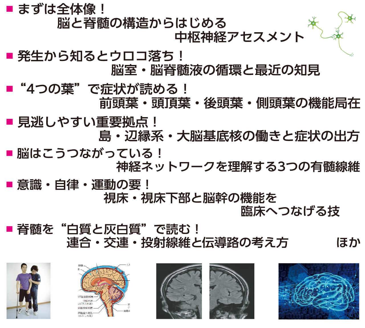 脳の構造や機能局在、伝導路、自律神経やホルモン…一通り暗記したけれど「臨床で使えない」と思っていませんか?その原因は解剖と生理学をバラバラに覚えてしまっていること。この講座は解剖博士の町田先生が、踏み込んだ解剖をベースに中枢神経・末梢神経・内分泌の生理学を一挙解説。教科書を暗記するのではなく、解剖の“仕組み”から機能へつなげて必要なポイントに絞って学ぶから、臨床に活きること間違いなし!知識を増やしたい若手はもちろん、自称若手、学びなおしたい中堅以上にお勧めの講座がいよいよ開講です。
