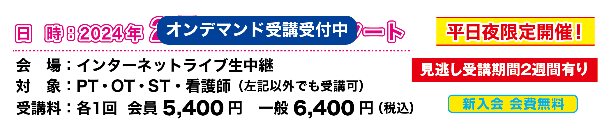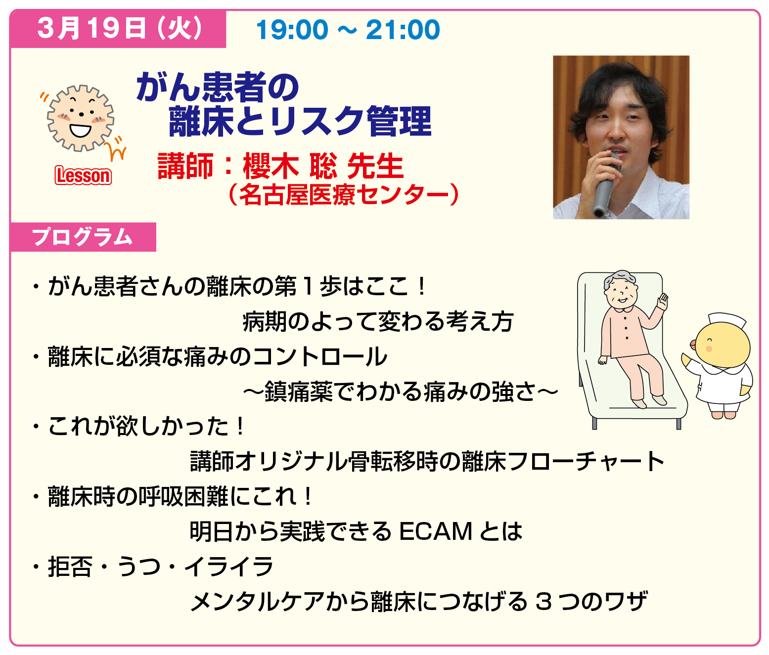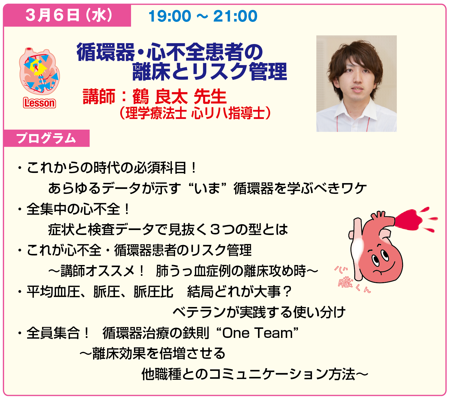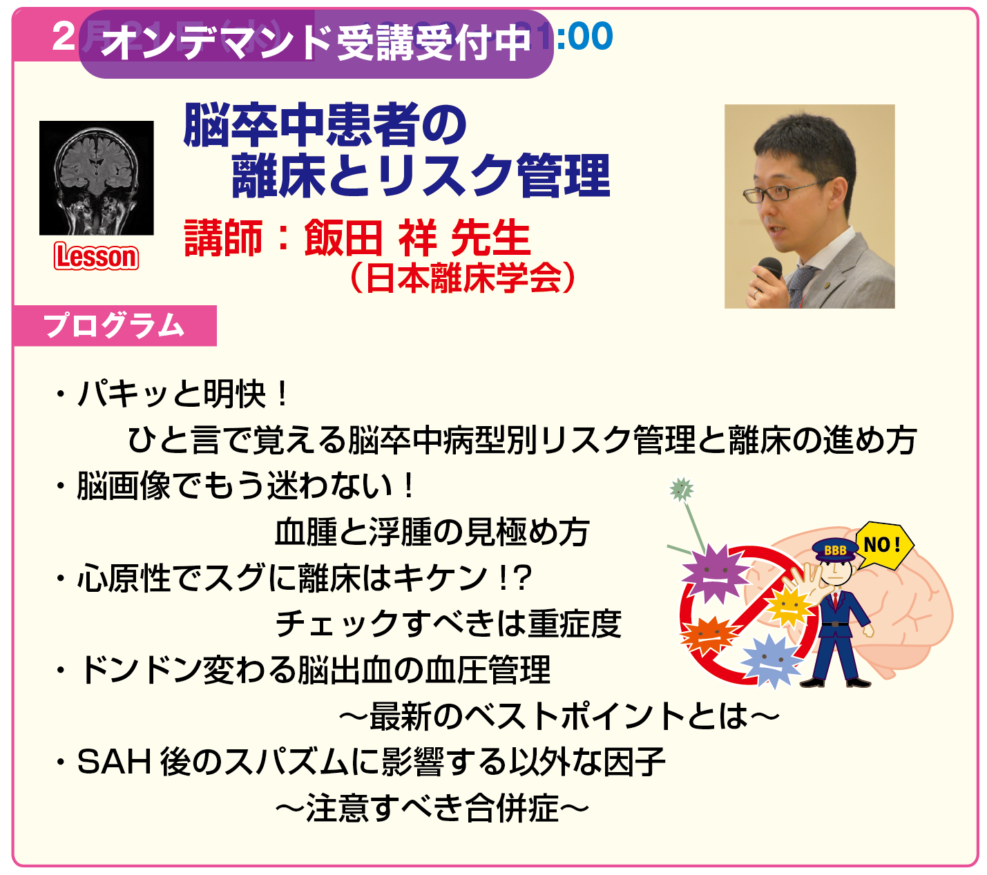 離床のタイミングが早くなり、急性期の患者さんに関わると、リスク管理の重要性が身にしみますよね。でも「リスク管理って何を勉強すればいいの?」と悩んでいませんか?そんな人にピッタリのコースを考案しました。疾患別に各領域のエキスパートが“ここが重要”というポイントに絞って、離床のリスク管理の具体策を教えてくれます。奮ってご参加ください。