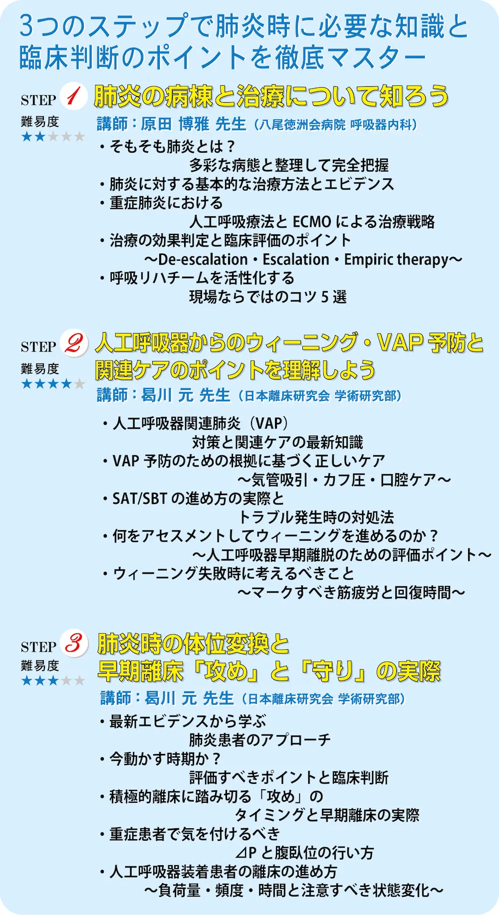 日本離床学会がオススメする「呼吸ニガテ克服プログラム」が4回シリーズとなって開催されます! このプログラムでは、ベテランの講師が “呼吸が悪い患者さんの離床に必要な知識” を徹底解説。 臨床的なデータの解釈やフィジカル所見、さらに呼吸の生理から機器のチェックまで、ゼッタイに必要な離床の知識を完全網羅します。 さあ、一緒に自信を持って患者さんのケア・離床を進めてみませんか?