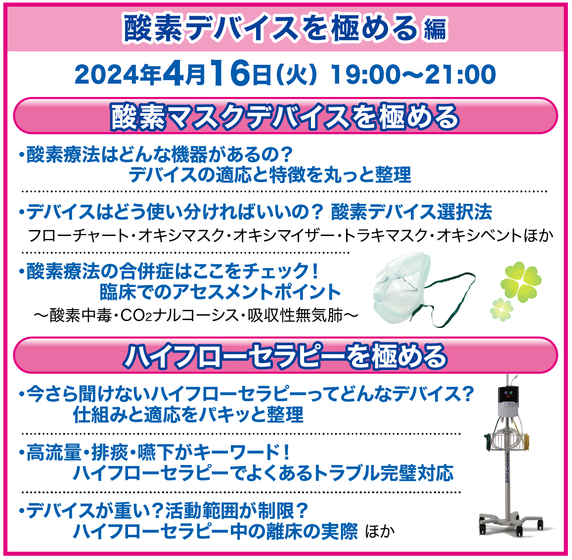 酸素療法の種類は色々あるけれど、流量と酸素濃度を守っていれば大丈夫と思っていませんか?実はその考えはキケン。デバイスの特徴をちゃんと知らないと、呼吸状態が悪化して急変につながることも…この講座では、多岐にわたる酸素療法の知識を日本離床学会講師陣がわかりやすく明快に解説。デバイスの選択と人工呼吸器と酸素療法の行き来について理解を深め、グンと臨床力を引き上げます。さあ、酸素療法の知識を今こそ見直して、日々の臨床に自信を加えてみませんか?