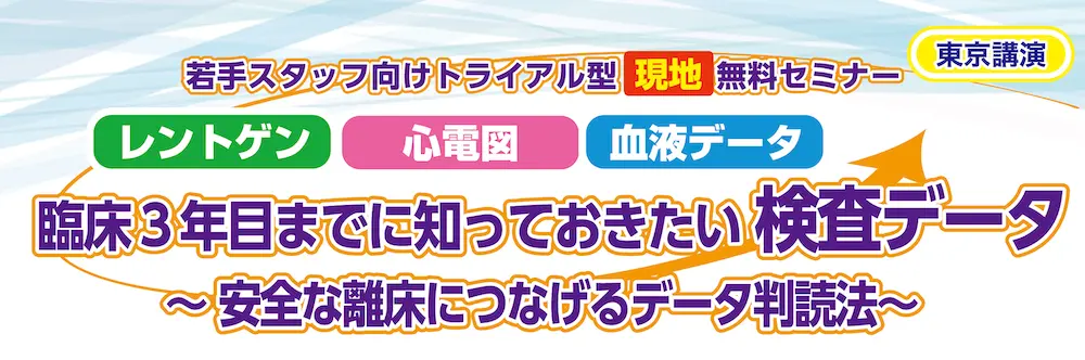 コロナ禍の影響で、オンラインの学びしか知らない若手スタッフに向け、嬉しいお知らせ!評判の人気講座を現地対面形式で無料開催します。今回のテーマは「レントゲン・心電図・血液データの読み方」。ポイントを絞って検査データを読み解き、離床のリスク管理に活かす読影法を無料で身につけるチャンスです。若手スタッフに対面講座の良さを体感してもらいたいという想いで企画したこのセミナーを、みんなで力を合わせて、成功させましょう!