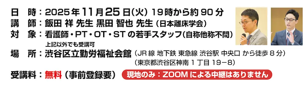 対象:看護師・PT・OT・STの若手スタッフ(自称他称不問)左記以外でも受講可